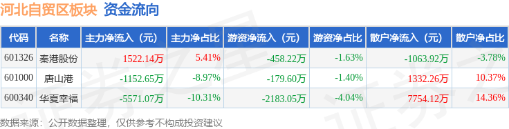 从资金流向上来看,当日河北自贸区板块主力资金净流出5201.59万元,游资资金净流出2820.87万元,散户资金净流入8022.46万元。河北自贸区板块个股资金流向见下表:
