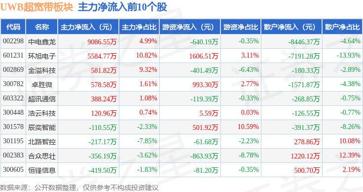 从资金流向上来看,当日UWB超宽带板块主力资金净流出3.19亿元,游资资金净流入4472.18万元,散户资金净流入2.74亿元。UWB超宽带板块个股资金流向见下表: