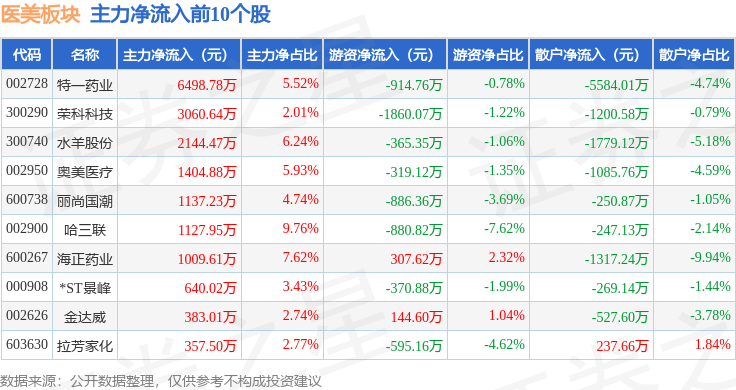 从资金流向上来看,当日医美板块主力资金净流出10.36亿元,游资资金净流入2.4亿元,散户资金净流入7.96亿元。医美板块个股资金流向见下表: