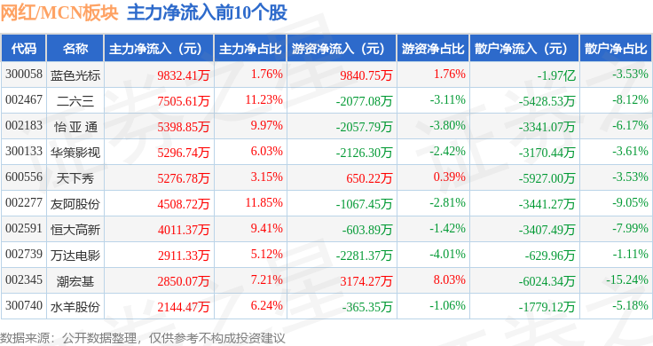 从资金流向上来看,当日网红/MCN板块主力资金净流出19.94亿元,游资资金净流入6.03亿元,散户资金净流入13.91亿元。网红/MCN板块个股资金流向见下表: