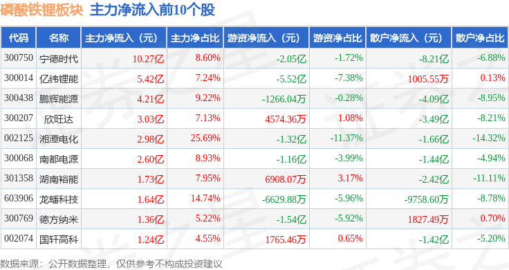 从资金流向上来看,当日磷酸铁锂板块主力资金净流入35.12亿元,游资资金净流出10.71亿元,散户资金净流出24.4亿元。磷酸铁锂板块个股资金流向见下表: