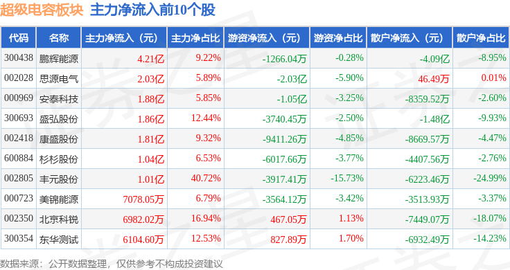 从资金流向上来看,当日超级电容板块主力资金净流入12.68亿元,游资资金净流出5.01亿元,散户资金净流出7.66亿元。超级电容板块个股资金流向见下表: