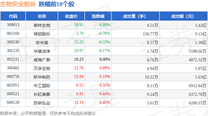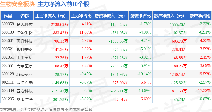 从资金流向上来看,当日生物安全板块主力资金净流出4119.47万元,游资资金净流出5132.83万元,散户资金净流入9252.3万元。生物安全板块个股资金流向见下表: