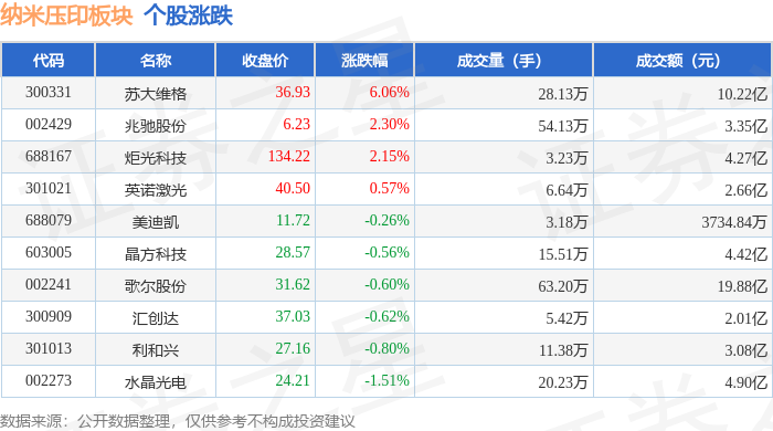 证券之星消息,11月5日纳米压印板块较上一交易日上涨0.13%,苏大维格领涨。当日上证指数报收于3969.25,上涨0.23%。深证成指报收于13223.56,上涨0.37%。纳米压印板块个股涨跌见下表: