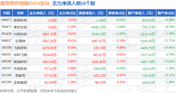 从资金流向上来看,当日高带宽存储器HBM板块主力资金净流出3.65亿元,游资资金净流出8672.32万元,散户资金净流入4.52亿元。高带宽存储器HBM板块个股资金流向见下表: