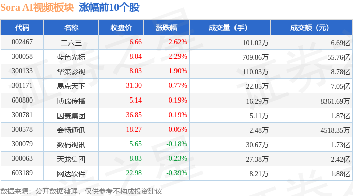 从资金流向上来看,当日Sora AI视频板块主力资金净流出5026.13万元,游资资金净流入1.09亿元,散户资金净流出5900.58万元。Sora AI视频板块个股资金流向见下表: