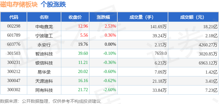 从资金流向上来看,当日磁电存储板块主力资金净流入1916.35万元,游资资金净流入796.73万元,散户资金净流出2713.08万元。磁电存储板块个股资金流向见下表: