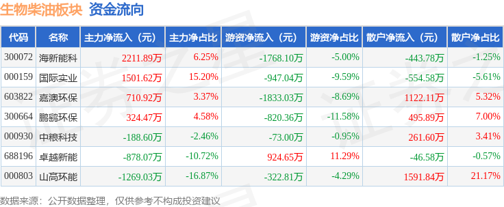 从资金流向上来看,当日生物柴油板块主力资金净流入2413.2万元,游资资金净流出4839.69万元,散户资金净流入2426.49万元。生物柴油板块个股资金流向见下表: