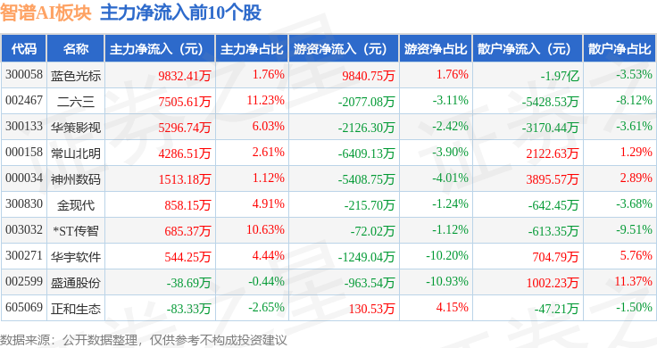 从资金流向上来看,当日智谱AI板块主力资金净流出5.92亿元,游资资金净流出2753.24万元,散户资金净流入6.19亿元。智谱AI板块个股资金流向见下表: