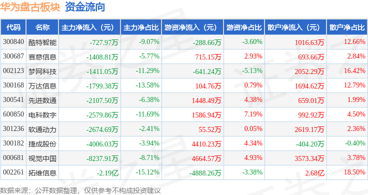从资金流向上来看,当日华为盘古板块主力资金净流出4.68亿元,游资资金净流入7167.49万元,散户资金净流入3.97亿元。华为盘古板块个股资金流向见下表: