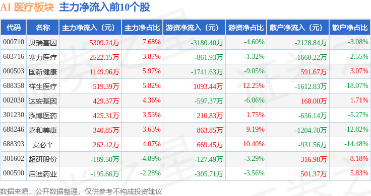从资金流向上来看,当日AI 医疗板块主力资金净流出2.06亿元,游资资金净流入366.86万元,散户资金净流入2.03亿元。AI 医疗板块个股资金流向见下表: