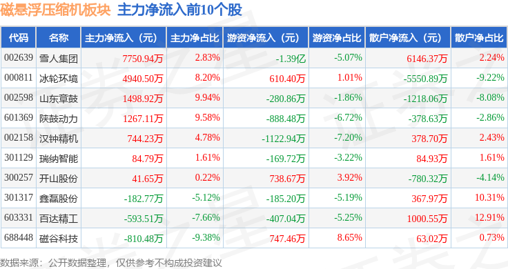 从资金流向上来看,当日磁悬浮压缩机板块主力资金净流入1.08亿元,游资资金净流出1.61亿元,散户资金净流入5286.96万元。磁悬浮压缩机板块个股资金流向见下表: