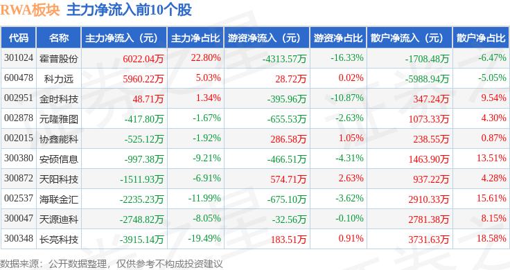 从资金流向上来看,当日RWA板块主力资金净流出5.25亿元,游资资金净流出2446.08万元,散户资金净流入5.49亿元。RWA板块个股资金流向见下表: