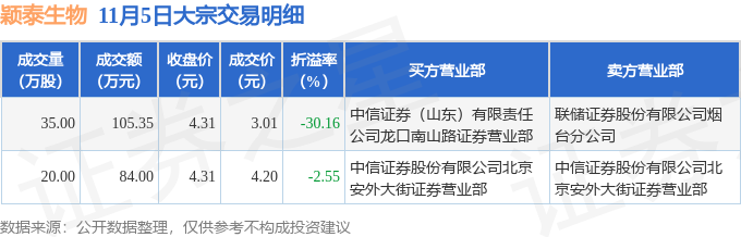 证券之星消息,11月5日颖泰生物发生大宗交易,交易数据如下: