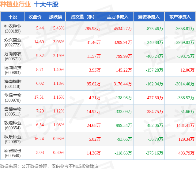 个股表现方面,种植业行业当日领涨股为神农种业(300189),该股当日报收5.44,上涨5.43%,成交量285.98万,主力资金净流入4534.27万元。众兴菌业(002772)以上涨3.03%紧随其后,该股当日成交量31.46万,主力资金净流入3209.91万元。除此之外,万向德农(600371)、博闻科技(600883)、海南橡胶(601118)均进入当日牛股之列。具体个股列表见下表: