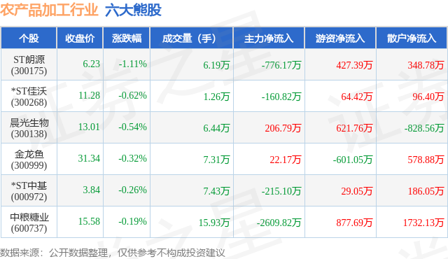 个股表现方面,农产品加工行业当日领跌股为ST朗源(300175),该股当日报收6.23,下跌1.11%,成交量6.19万,主力资金净流出776.17万元。*ST佳沃(300268)以下跌0.62%紧随其后,该股当日成交量1.26万,主力资金净流出160.82万元。除此之外,晨光生物(300138)、金龙鱼(300999)、*ST中基(000972)均进入当日熊股之列。具体个股列表见下表: