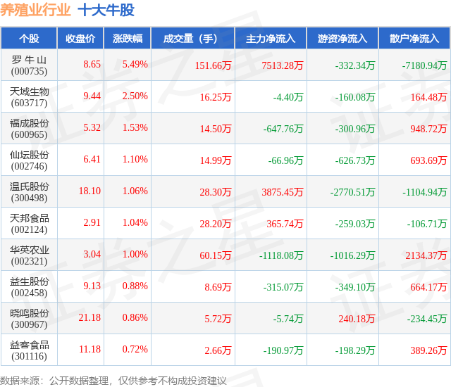 个股表现方面,养殖业行业当日领涨股为罗 牛 山(000735),该股当日报收8.65,上涨5.49%,成交量151.66万,主力资金净流入7513.28万元。天域生物(603717)以上涨2.5%紧随其后,该股当日成交量16.25万,主力资金净流出4.4万元。除此之外,福成股份(600965)、仙坛股份(002746)、温氏股份(300498)均进入当日牛股之列。具体个股列表见下表: