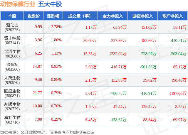 个股表现方面,动物保健行业当日领涨股为驱动力(920275),该股当日报收9.99,上涨2.78%,成交量1.17万,主力资金净流入63.94万元。贤丰控股(002141)以上涨1.8%紧随其后,该股当日成交量30.0万,主力资金净流入227.86万元。除此之外,金河生物(002688)、普莱柯(603566)、大禹生物(920970)均进入当日牛股之列。具体个股列表见下表: