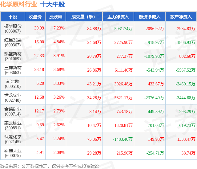 个股表现方面,化学原料行业当日领涨股为振华股份(603067),该股当日报收30.09,上涨7.23%,成交量84.88万,主力资金净流出5031.74万元。红星发展(600367)以上涨4.84%紧随其后,该股当日成交量24.68万,主力资金净流入2725.9万元。除此之外,凯盛新材(301069)、三祥新材(603663)、新金路(000510)均进入当日牛股之列。具体个股列表见下表: