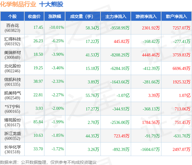 个股表现方面,化学制品行业当日领跌股为百合花(603823),该股当日报收17.45,下跌10.01%,成交量58.34万,主力资金净流出9558.99万元。汇得科技(603192)以下跌6.25%紧随其后,该股当日成交量17.22万,主力资金净流入445.82万元。除此之外,美瑞新材(300848)、北化股份(002246)、信凯科技(001335)均进入当日熊股之列。具体个股列表见下表: