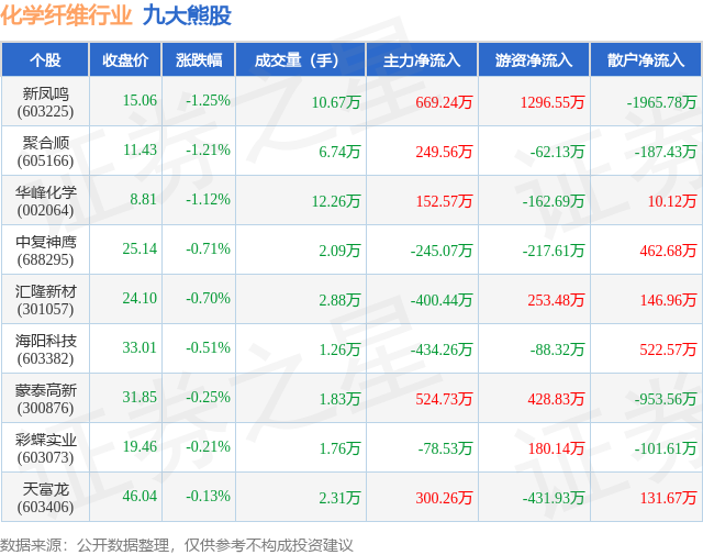 个股表现方面,化学纤维行业当日领跌股为新凤鸣(603225),该股当日报收15.06,下跌1.25%,成交量10.67万,主力资金净流入669.24万元。聚合顺(605166)以下跌1.21%紧随其后,该股当日成交量6.74万,主力资金净流入249.56万元。除此之外,华峰化学(002064)、中复神鹰(688295)、汇隆新材(301057)均进入当日熊股之列。具体个股列表见下表: