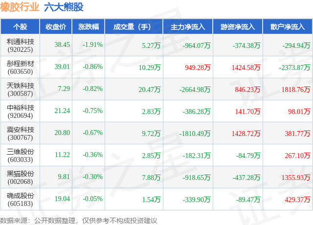 个股表现方面,橡胶行业当日领跌股为利通科技(920225),该股当日报收38.45,下跌1.91%,成交量5.27万,主力资金净流出964.07万元。彤程新材(603650)以下跌0.86%紧随其后,该股当日成交量10.29万,主力资金净流入949.28万元。除此之外,天铁科技(300587)、中裕科技(920694)、震安科技(300767)均进入当日熊股之列。具体个股列表见下表: