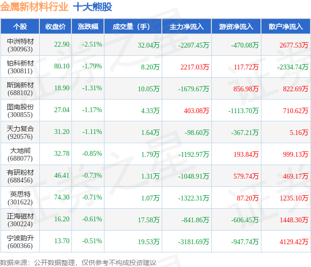 个股表现方面,金属新材料行业当日领跌股为中洲特材(300963),该股当日报收22.9,下跌2.51%,成交量32.04万,主力资金净流出2207.45万元。铂科新材(300811)以下跌1.79%紧随其后,该股当日成交量8.2万,主力资金净流入2217.03万元。除此之外,斯瑞新材(688102)、图南股份(300855)、天力复合(920576)均进入当日熊股之列。具体个股列表见下表: