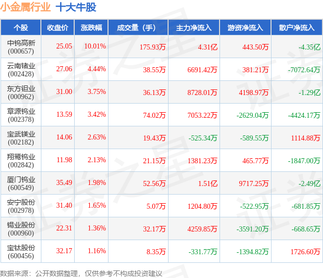 个股表现方面,小金属行业当日领涨股为中钨高新(000657),该股当日报收25.05,上涨10.01%,成交量175.93万,主力资金净流入4.31亿元。云南锗业(002428)以上涨4.44%紧随其后,该股当日成交量38.55万,主力资金净流入6691.42万元。除此之外,东方钽业(000962)、章源钨业(002378)、宝武镁业(002182)均进入当日牛股之列。具体个股列表见下表: