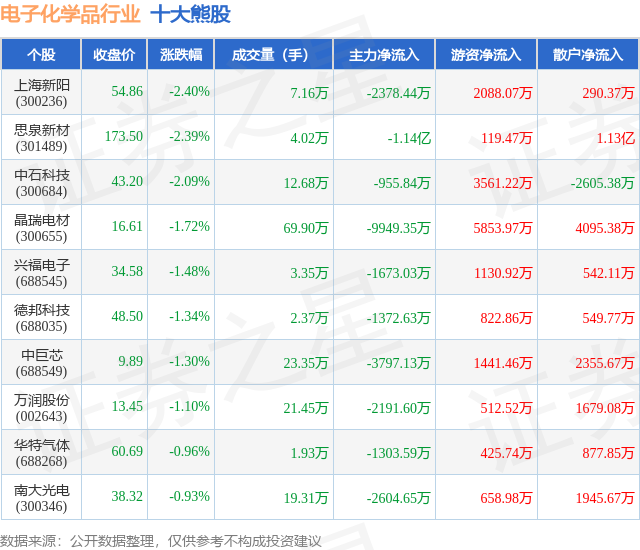 个股表现方面,电子化学品行业当日领跌股为上海新阳(300236),该股当日报收54.86,下跌2.4%,成交量7.16万,主力资金净流出2378.44万元。思泉新材(301489)以下跌2.39%紧随其后,该股当日成交量4.02万,主力资金净流出1.14亿元。除此之外,中石科技(300684)、晶瑞电材(300655)、兴福电子(688545)均进入当日熊股之列。具体个股列表见下表:
