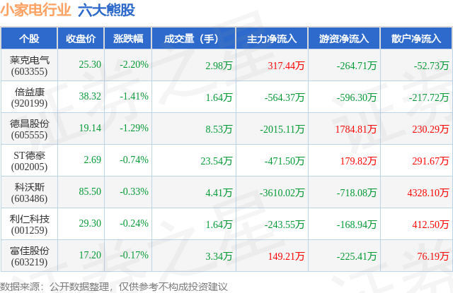 个股表现方面,小家电行业当日领跌股为莱克电气(603355),该股当日报收25.3,下跌2.2%,成交量2.98万,主力资金净流入317.44万元。倍益康(920199)以下跌1.41%紧随其后,该股当日成交量1.64万,主力资金净流出564.37万元。除此之外,德昌股份(605555)、ST德豪(002005)、科沃斯(603486)均进入当日熊股之列。具体个股列表见下表: