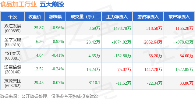 个股表现方面,食品加工行业当日领跌股为双汇发展(000895),该股当日报收25.87,下跌0.96%,成交量8.69万,主力资金净流出1473.78万元。金字火腿(002515)以下跌0.93%紧随其后,该股当日成交量28.42万,主力资金净流出1074.02万元。除此之外,*ST春天(600381)、汤臣倍健(300146)、技源集团(603262)均进入当日熊股之列。具体个股列表见下表: