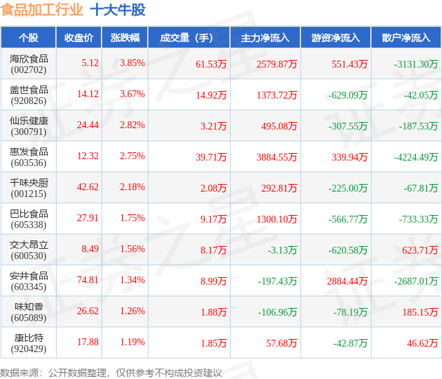 个股表现方面,食品加工行业当日领涨股为海欣食品(002702),该股当日报收5.12,上涨3.85%,成交量61.53万,主力资金净流入2579.87万元。盖世食品(920826)以上涨3.67%紧随其后,该股当日成交量14.92万,主力资金净流入1373.72万元。除此之外,仙乐健康(300791)、惠发食品(603536)、千味央厨(001215)均进入当日牛股之列。具体个股列表见下表: