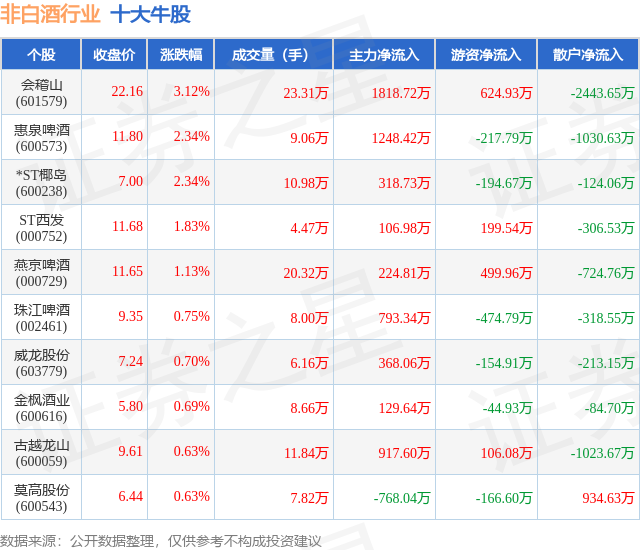 个股表现方面,非白酒行业当日领涨股为会稽山(601579),该股当日报收22.16,上涨3.12%,成交量23.31万,主力资金净流入1818.72万元。惠泉啤酒(600573)以上涨2.34%紧随其后,该股当日成交量9.06万,主力资金净流入1248.42万元。除此之外,*ST椰岛(600238)、ST西发(000752)、燕京啤酒(000729)均进入当日牛股之列。具体个股列表见下表: