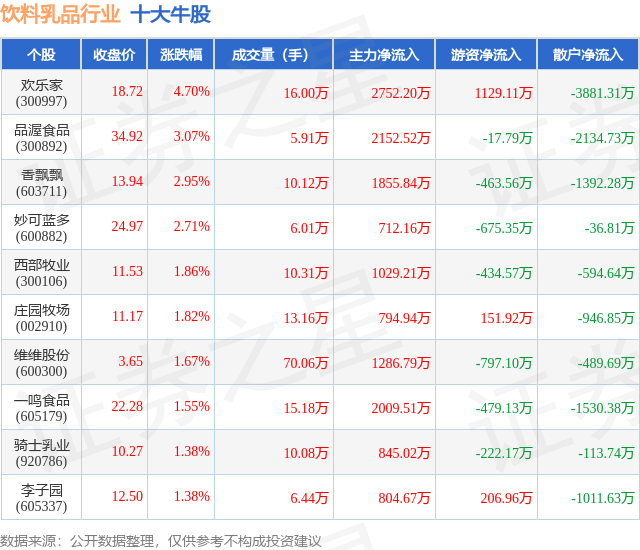 个股表现方面,饮料乳品行业当日领涨股为欢乐家(300997),该股当日报收18.72,上涨4.7%,成交量16.0万,主力资金净流入2752.2万元。品渥食品(300892)以上涨3.07%紧随其后,该股当日成交量5.91万,主力资金净流入2152.52万元。除此之外,香飘飘(603711)、妙可蓝多(600882)、西部牧业(300106)均进入当日牛股之列。具体个股列表见下表: