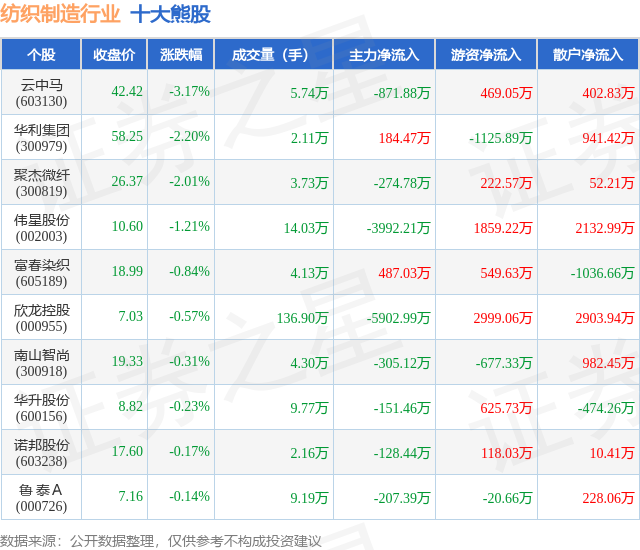 个股表现方面,纺织制造行业当日领跌股为云中马(603130),该股当日报收42.42,下跌3.17%,成交量5.74万,主力资金净流出871.88万元。华利集团(300979)以下跌2.2%紧随其后,该股当日成交量2.11万,主力资金净流入184.47万元。除此之外,聚杰微纤(300819)、伟星股份(002003)、富春染织(605189)均进入当日熊股之列。具体个股列表见下表: