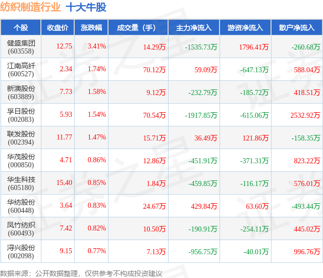 个股表现方面,纺织制造行业当日领涨股为健盛集团(603558),该股当日报收12.75,上涨3.41%,成交量14.29万,主力资金净流出1535.73万元。江南高纤(600527)以上涨1.74%紧随其后,该股当日成交量70.12万,主力资金净流入59.09万元。除此之外,新澳股份(603889)、孚日股份(002083)、联发股份(002394)均进入当日牛股之列。具体个股列表见下表: