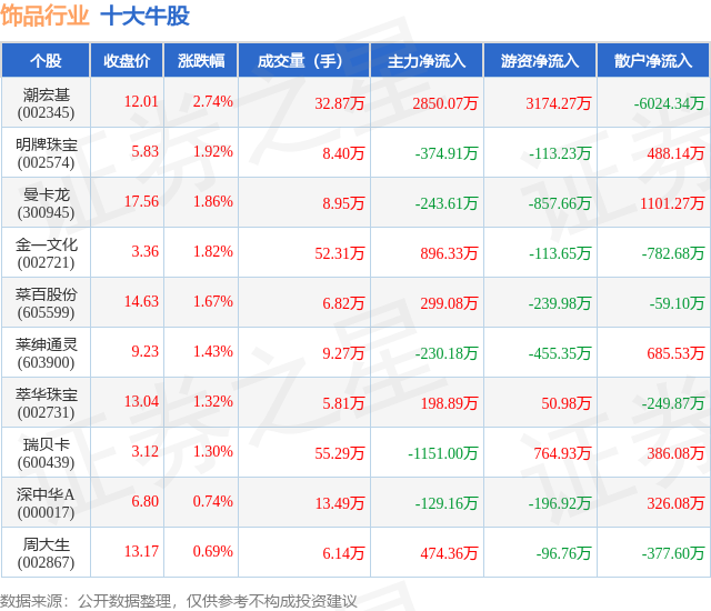 个股表现方面,饰品行业当日领涨股为潮宏基(002345),该股当日报收12.01,上涨2.74%,成交量32.87万,主力资金净流入2850.07万元。明牌珠宝(002574)以上涨1.92%紧随其后,该股当日成交量8.4万,主力资金净流出374.91万元。除此之外,曼卡龙(300945)、金一文化(002721)、菜百股份(605599)均进入当日牛股之列。具体个股列表见下表: