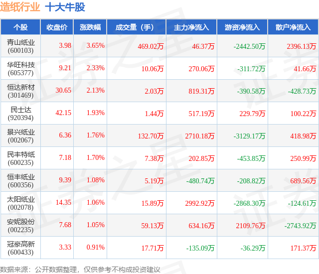 个股表现方面,造纸行业当日领涨股为青山纸业(600103),该股当日报收3.98,上涨3.65%,成交量469.02万,主力资金净流入46.37万元。华旺科技(605377)以上涨2.33%紧随其后,该股当日成交量10.06万,主力资金净流入270.06万元。除此之外,恒达新材(301469)、民士达(920394)、景兴纸业(002067)均进入当日牛股之列。具体个股列表见下表: