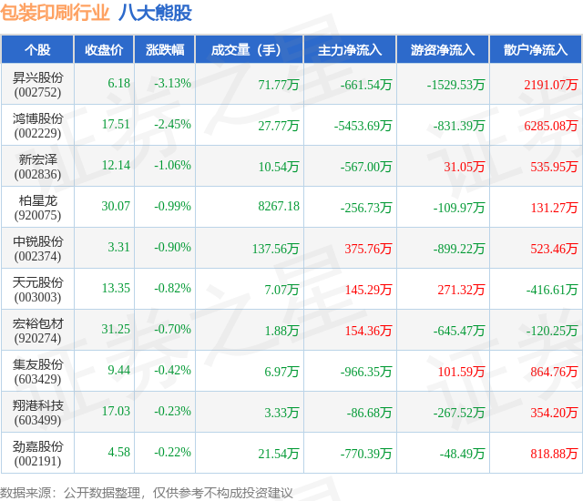 个股表现方面,包装印刷行业当日领跌股为昇兴股份(002752),该股当日报收6.18,下跌3.13%,成交量71.77万,主力资金净流出661.54万元。鸿博股份(002229)以下跌2.45%紧随其后,该股当日成交量27.77万,主力资金净流出5453.69万元。除此之外,新宏泽(002836)、柏星龙(920075)、中锐股份(002374)均进入当日熊股之列。具体个股列表见下表: