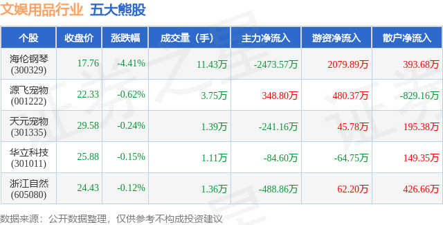 个股表现方面,文娱用品行业当日领跌股为海伦钢琴(300329),该股当日报收17.76,下跌4.41%,成交量11.43万,主力资金净流出2473.57万元。源飞宠物(001222)以下跌0.62%紧随其后,该股当日成交量3.75万,主力资金净流入348.8万元。除此之外,天元宠物(301335)、华立科技(301011)、浙江自然(605080)均进入当日熊股之列。具体个股列表见下表: