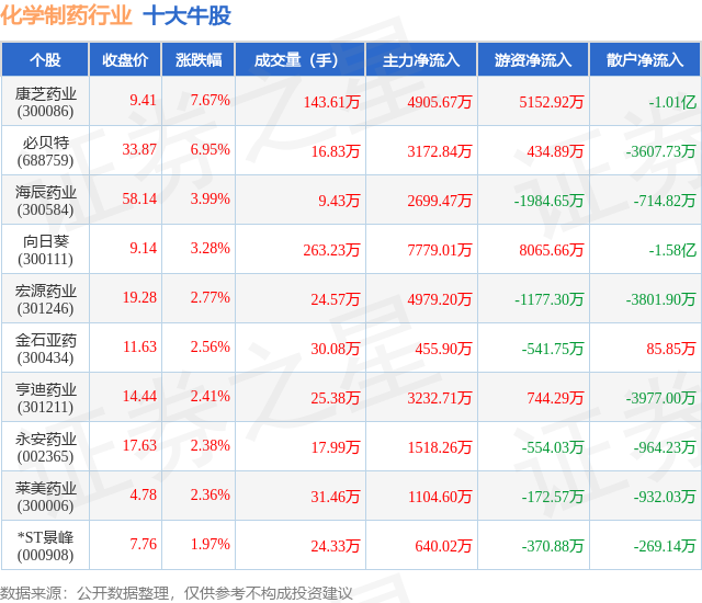 个股表现方面,化学制药行业当日领涨股为康芝药业(300086),该股当日报收9.41,上涨7.67%,成交量143.61万,主力资金净流入4905.67万元。必贝特(688759)以上涨6.95%紧随其后,该股当日成交量16.83万,主力资金净流入3172.84万元。除此之外,海辰药业(300584)、向日葵(300111)、宏源药业(301246)均进入当日牛股之列。具体个股列表见下表: