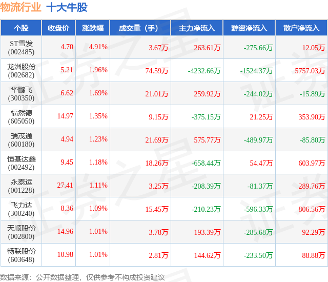 个股表现方面,物流行业当日领涨股为ST雪发(002485),该股当日报收4.7,上涨4.91%,成交量3.67万,主力资金净流入263.61万元。龙洲股份(002682)以上涨1.96%紧随其后,该股当日成交量74.59万,主力资金净流出4232.66万元。除此之外,华鹏飞(300350)、福然德(605050)、瑞茂通(600180)均进入当日牛股之列。具体个股列表见下表: