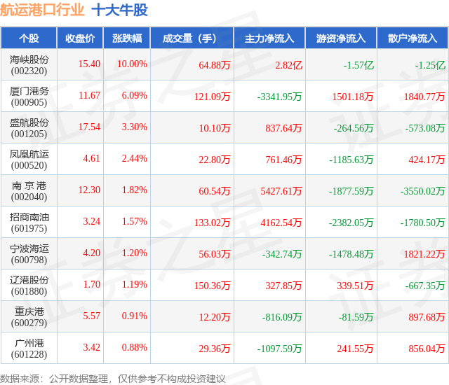 个股表现方面,航运港口行业当日领涨股为海峡股份(002320),该股当日报收15.4,上涨10.0%,成交量64.88万,主力资金净流入2.82亿元。厦门港务(000905)以上涨6.09%紧随其后,该股当日成交量121.09万,主力资金净流出3341.95万元。除此之外,盛航股份(001205)、凤凰航运(000520)、南 京 港(002040)均进入当日牛股之列。具体个股列表见下表: