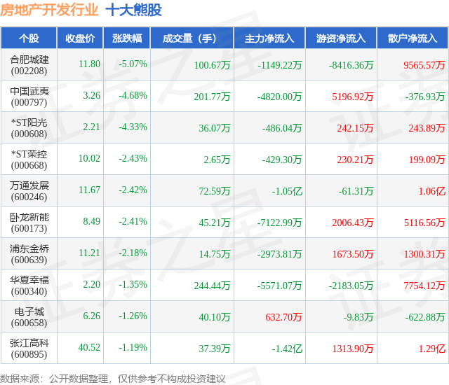 个股表现方面,房地产开发行业当日领跌股为合肥城建(002208),该股当日报收11.8,下跌5.07%,成交量100.67万,主力资金净流出1149.22万元。中国武夷(000797)以下跌4.68%紧随其后,该股当日成交量201.77万,主力资金净流出4820.0万元。除此之外,*ST阳光(000608)、*ST荣控(000668)、万通发展(600246)均进入当日熊股之列。具体个股列表见下表: