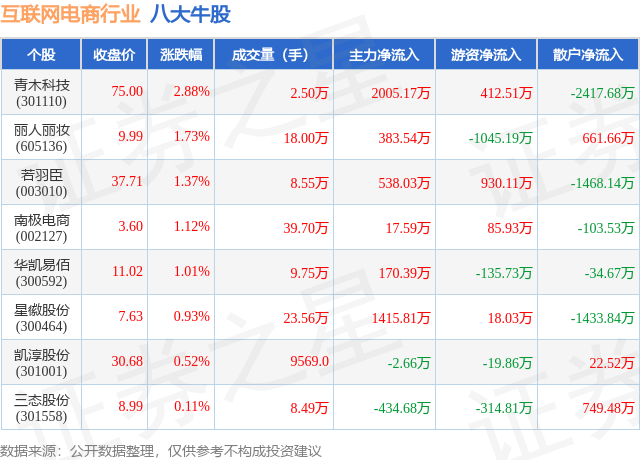 个股表现方面,互联网电商行业当日领涨股为青木科技(301110),该股当日报收75.0,上涨2.88%,成交量2.5万,主力资金净流入2005.17万元。丽人丽妆(605136)以上涨1.73%紧随其后,该股当日成交量18.0万,主力资金净流入383.54万元。除此之外,若羽臣(003010)、南极电商(002127)、华凯易佰(300592)均进入当日牛股之列。具体个股列表见下表:
