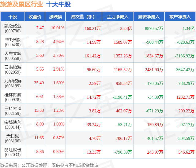 个股表现方面,旅游及景区行业当日领涨股为凯撒旅业(000796),该股当日报收7.47,上涨10.01%,成交量160.21万,主力资金净流入2.23亿元。*ST张股(000430)以上涨4.94%紧随其后,该股当日成交量14.99万,主力资金净流入1589.07万元。除此之外,天府文旅(000558)、云南旅游(002059)、九华旅游(603199)均进入当日牛股之列。具体个股列表见下表: