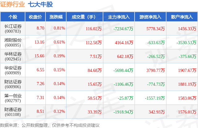 个股表现方面,证券行业当日领涨股为长江证券(000783),该股当日报收8.7,上涨0.81%,成交量116.02万,主力资金净流出7234.67万元。湘财股份(600095)以上涨0.61%紧随其后,该股当日成交量112.58万,主力资金净流入4164.16万元。除此之外,华林证券(002945)、华安证券(600909)、财达证券(600906)均进入当日牛股之列。具体个股列表见下表: