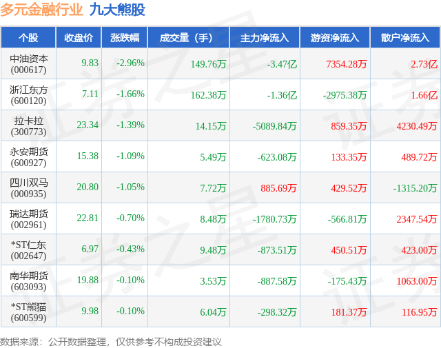 个股表现方面,多元金融行业当日领跌股为中油资本(000617),该股当日报收9.83,下跌2.96%,成交量149.76万,主力资金净流出3.47亿元。浙江东方(600120)以下跌1.66%紧随其后,该股当日成交量162.38万,主力资金净流出1.36亿元。除此之外,拉卡拉(300773)、永安期货(600927)、四川双马(000935)均进入当日熊股之列。具体个股列表见下表: