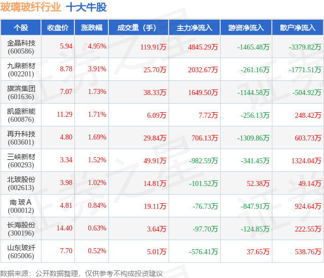 个股表现方面,玻璃玻纤行业当日领涨股为金晶科技(600586),该股当日报收5.94,上涨4.95%,成交量119.91万,主力资金净流入4845.29万元。九鼎新材(002201)以上涨3.91%紧随其后,该股当日成交量25.7万,主力资金净流入2032.67万元。除此之外,旗滨集团(601636)、凯盛新能(600876)、再升科技(603601)均进入当日牛股之列。具体个股列表见下表: