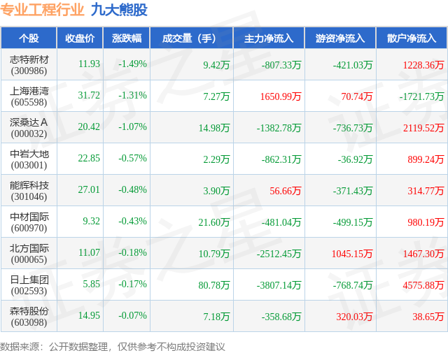 个股表现方面,专业工程行业当日领跌股为志特新材(300986),该股当日报收11.93,下跌1.49%,成交量9.42万,主力资金净流出807.33万元。上海港湾(605598)以下跌1.31%紧随其后,该股当日成交量7.27万,主力资金净流入1650.99万元。除此之外,深桑达A(000032)、中岩大地(003001)、能辉科技(301046)均进入当日熊股之列。具体个股列表见下表: